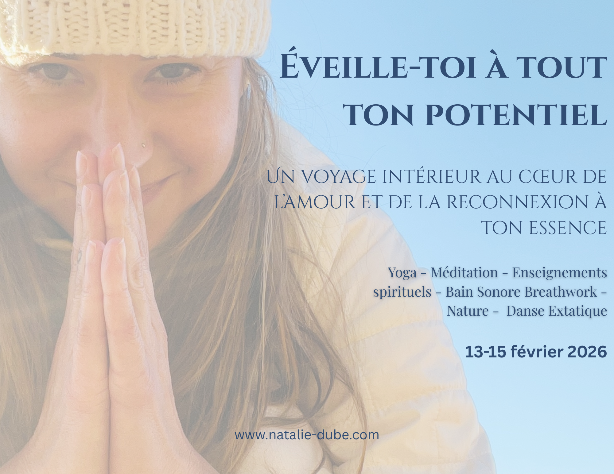 Chaque moment sera guidé par l’énergie lumineuse et bienveillante de Natalie Dubé, dans une ambiance d’amour, d’authenticité et de reconnexion.